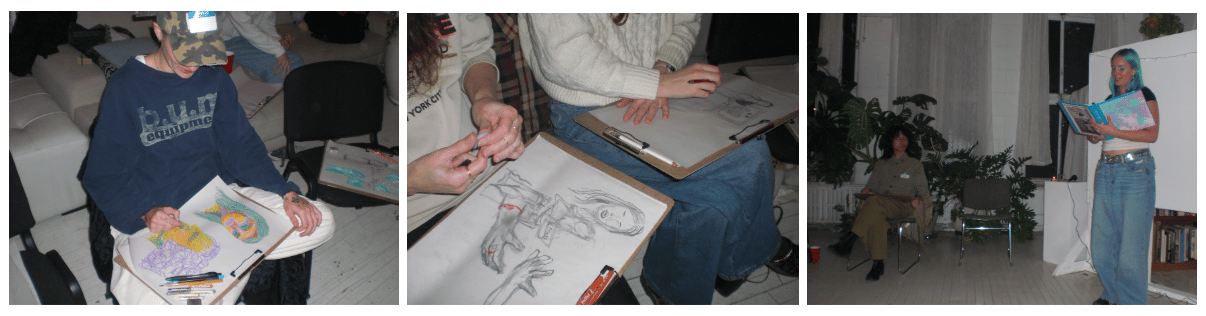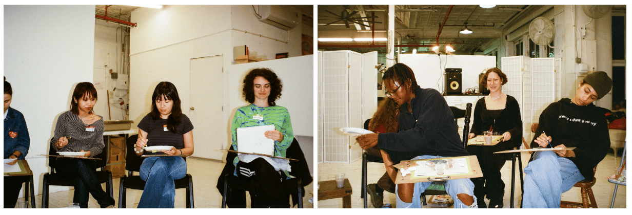 What makes the origin story so endearing is how close it came to dissolving the second Eliana left New York for her year-long grad program. The whole thing could have faded like most well-intentioned art projects do – swallowed by group chats and conflicting schedules – but she refused that fate. She named it, branded it, and wrote a guidebook like a tiny manifesto for how to keep a fragile creative ecosystem alive. Then she handed it to the people she trusted most – her twin sister Kayla and their Godspeed-studio-mate Anya, who kept the weekly session thriving while she was gone. They didn’t just maintain it; they expanded it. When Eliana finally returned, Anya stepped aside with the kind of grace that makes you believe humans are occasionally good, and the twins stepped naturally into running the weekly drawing night together. There is something unreasonably charming about sisters co-running a session inside a shared studio that is not technically theirs, yet seems to bend toward them every Tuesday. They speak in shorthand. They balance each other. They operate without the polite fragility that normally ruins creative partnerships. For them, Go Figure has become a weekly ritual – part sibling bonding, part community caretaking.